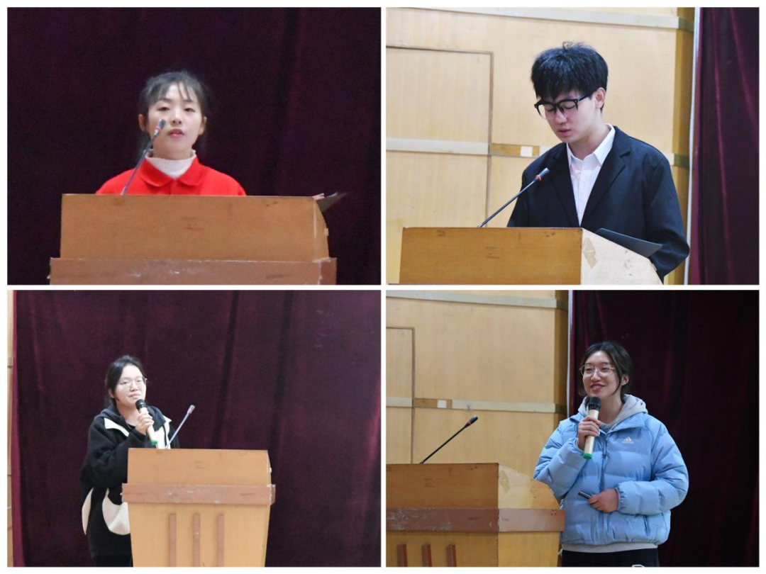 天津市优秀学生干部吕淇围绕“自强、刻苦、认真、实践”四个方面讲述了“学习+热爱+坚持=成长”的道理;天津市优秀学生程炳儒结合自身经历鼓励同学们要做到求真务实、珍惜时间;国家奖学金获得者奉雨晴通过“稳、韧、进、敢”四字为切入点,激励同学们要脚踏实地才有能力去追逐诗和远方;天津市人民政府奖学金获得者贾文辉从学习、科研、生活、工作、理想讲起,着重强调了参加竞赛和志愿实践的重要性。