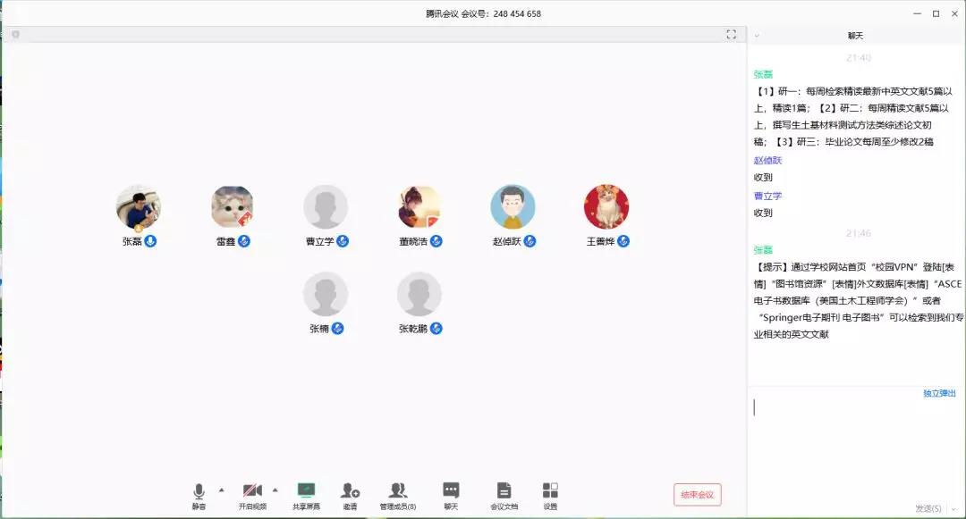 采用腾讯视频会议和微信相结合的形式对研究生进行在线指导。针对一年级和二年级研究生,指导他们利用校园VPN访问图书馆资源,尤其是利用好“ASCE电子书数据库(美国土木工程师学会)”和“Springer电子期刊”等外文数据库,以获取本领域最新的研究工作进展。同时,采用问题导向的方式给研究生布置专项任务,以提高其文献检索、问题分析和解决问题的能力。针对三年级研究生,在寒假期间已经撰写了毕业论文初稿,通过微信进行一对一指导,助其进一步完善毕业论文的结果讨论和机理分析等内容。