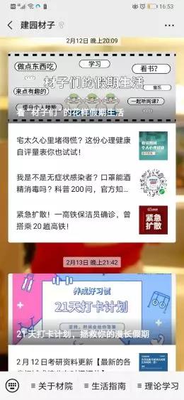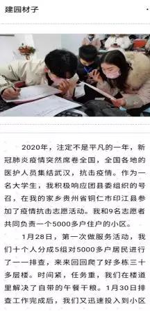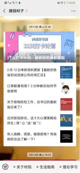 在学生工作方面,学院通过腾讯会议等方式做好学生日报信息统计工作、摸排学生在线学习困难的同时,针对学院在湖北籍的学生开展电话视频家访,在家访中,辅导员给学生家庭送去关心与祝福,嘱咐家长要督促学生做好开学上课准备,制定新学期学习规划,合理安排在家里学习的时间。另一方面了解学生健康状况,引导学生做好防护保证安全,守护好自己和家人健康。为了丰富学生假期活动,学院先后发起“21天打卡活动”;开展云辅导朋辈学业帮扶、“职不我待”就业指导服务等活动。同时,材料学子充分发挥“党有号召、团有行动”的优良传统,一方面通过在线发声、诗画送祝福、云合唱等方式声援武汉,一方面主动参与到所在社区防控工作中来,学院先后有26人投身疫情排查一线参与志愿服务工作,此材料学子积极为疫区捐资捐物,其中,19级高分子1班李正天和家人向甘肃金昌相关单位捐赠现金20000元,捐赠矿泉水、方便面等急需物资累计60余箱。