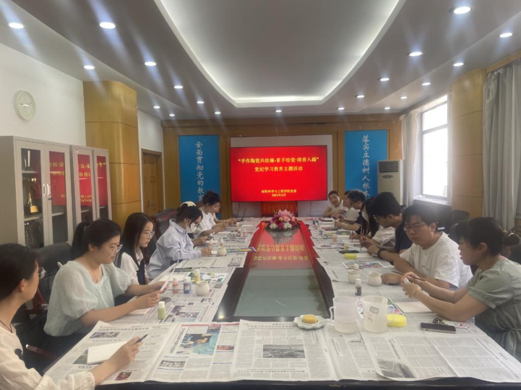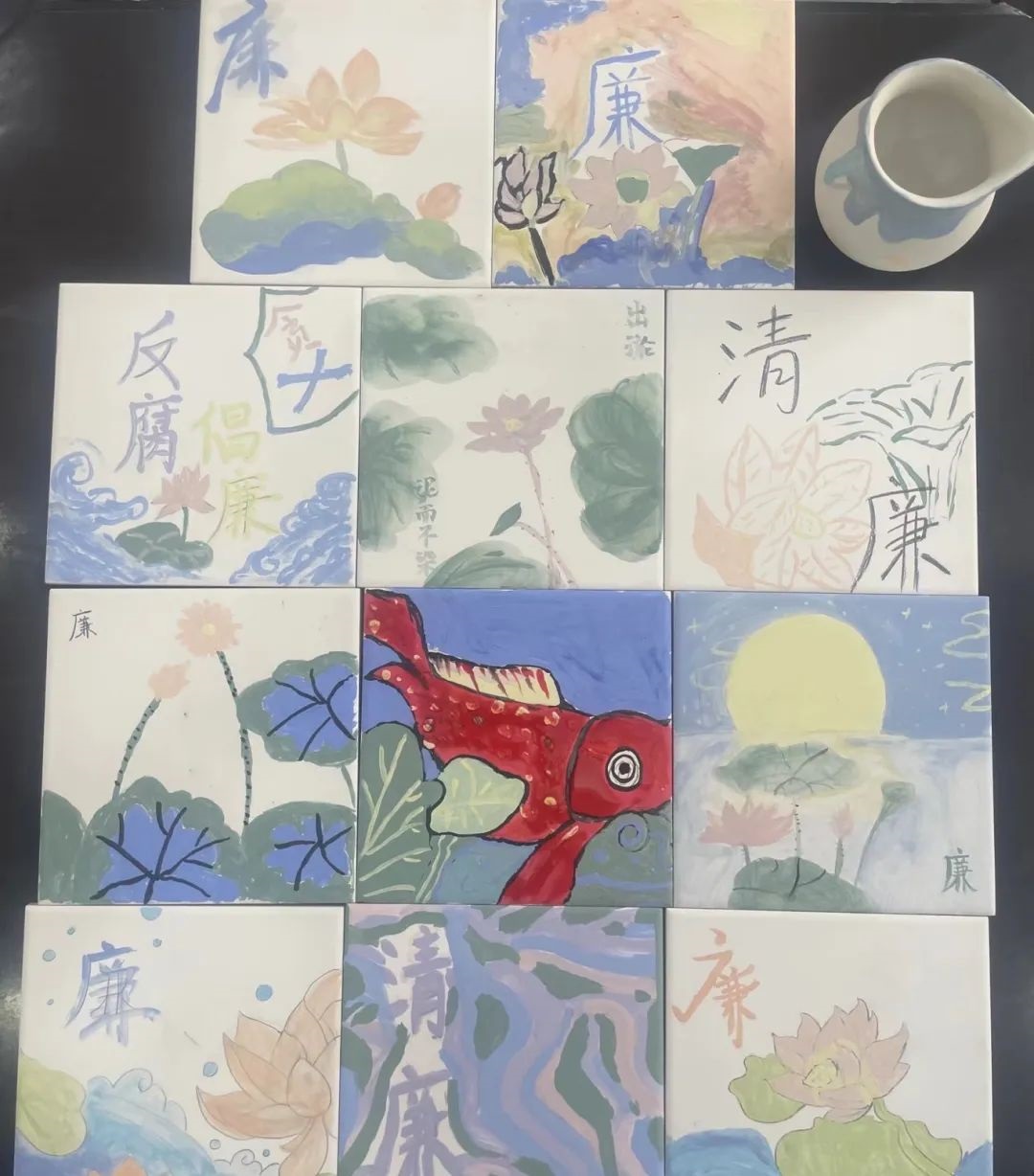 材料学院党委依托学院陶瓷文化传承与制作科普基地,融以文化人于学习教育之中,组织师生党员在亲手烧制得陶艺制品上绘制莲花、青竹等内容,讲述陶艺制品上绘制图案的意蕴及个人的体悟,潜移默化地把倡廉、遵廉、守廉侵染于心,落实于行。