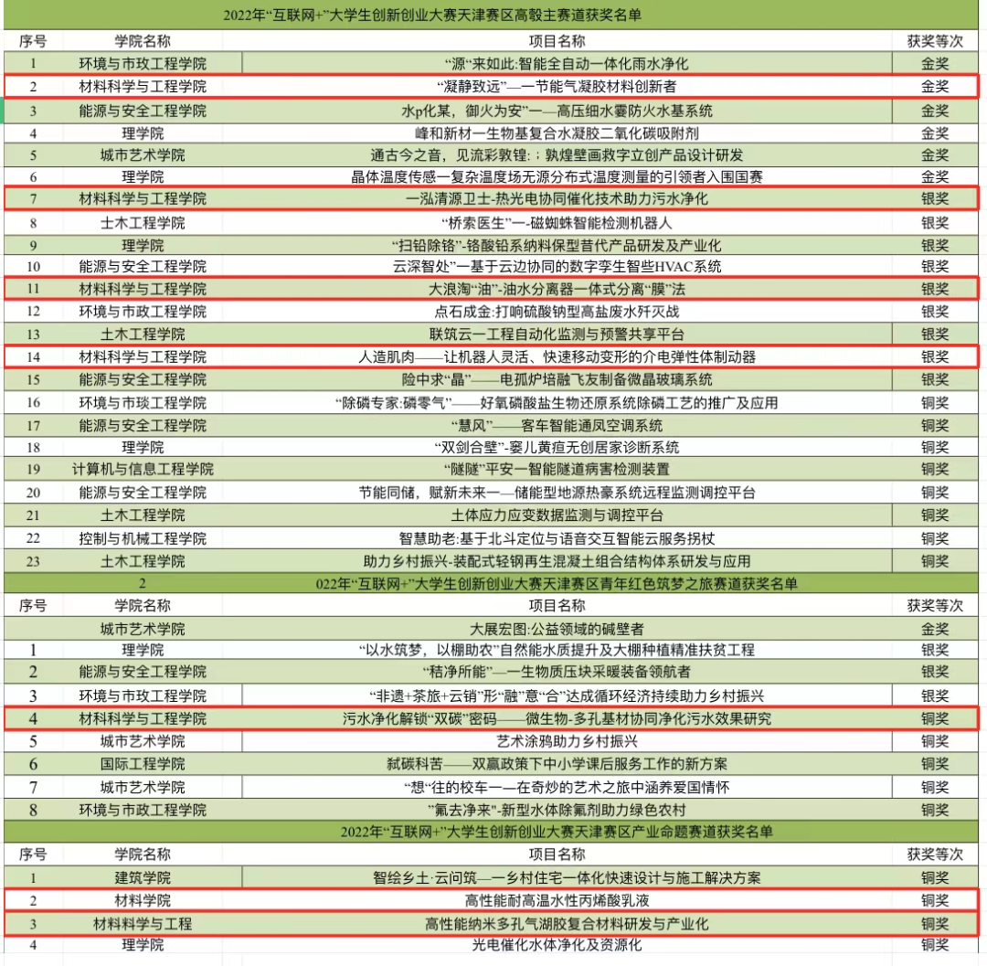 为提高学生科技竞赛积极性,学院师生积极参加全国第八届中国“互联网+”大学生创新创业大赛,不断完善项目内容、提高创新思维、提升创业能力。在学院师生共同努力下,获得高教主赛道天津市金奖1项、高教主赛道天津市银奖3项、“青年红色筑梦之旅”赛道天津市铜奖1项,产业命题赛道天津市铜奖2项。